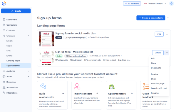 • Share your sign-up forms and landing pages directly to social to grow your contact list.