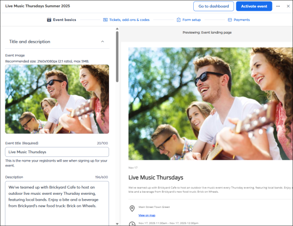 • Click Activate event once it’s ready to go. Your event page goes live instantly, and you can start accepting registrations.